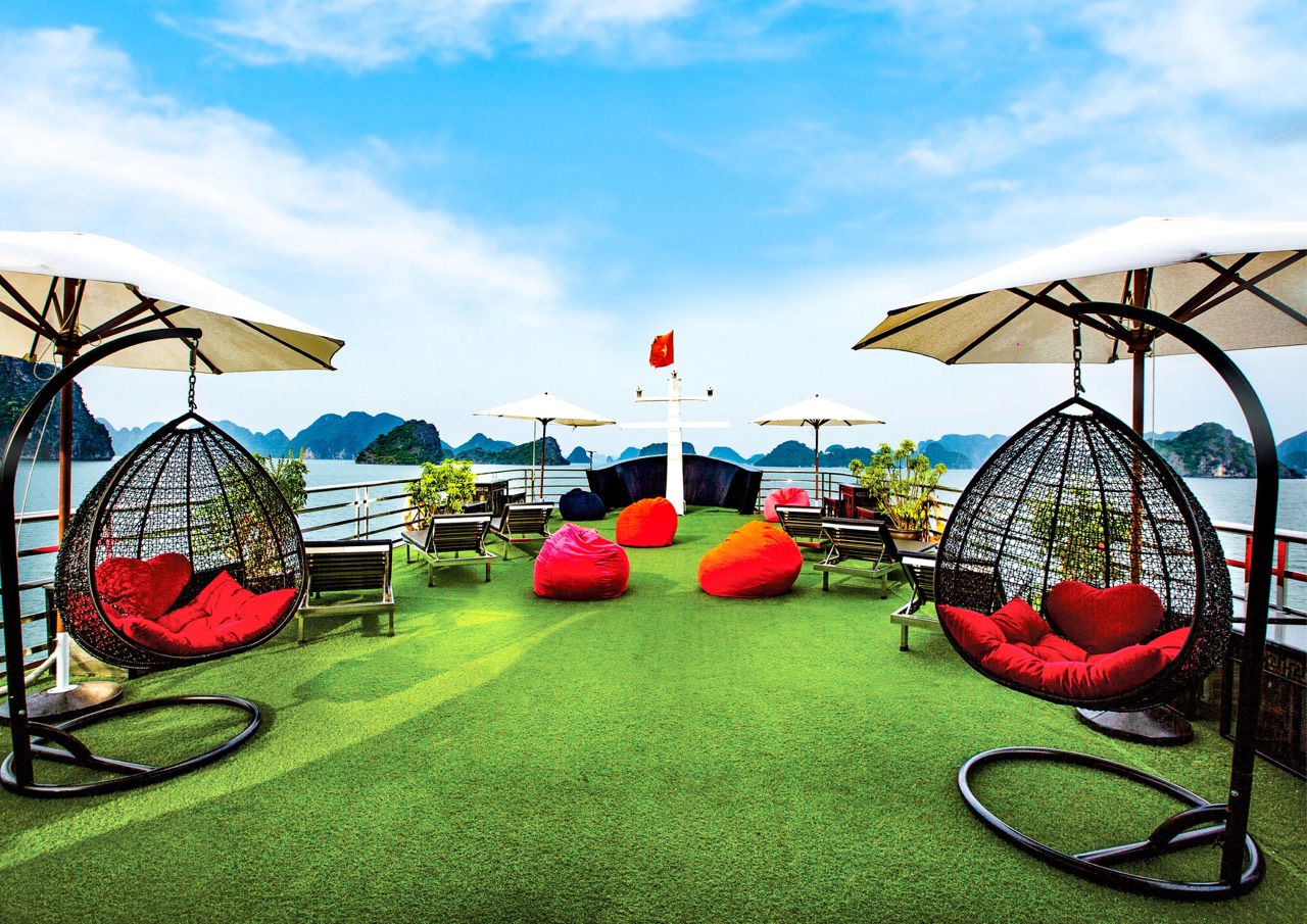 The third floor features a sundeck where guests can sunbathe and relax, enjoying the beautiful scenery of Ha Long Bay.