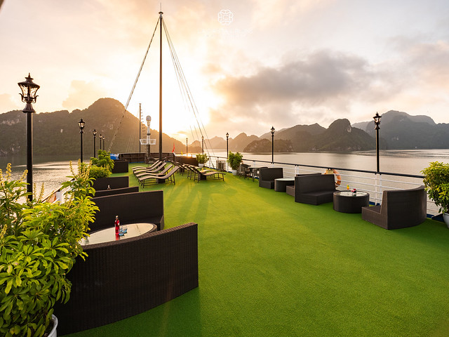 06:15 am: Guests enjoy the sunrise over the bay, join a Tai Chi class led by an instructor onboard, and take in the fresh morning air of Lan Ha Bay.