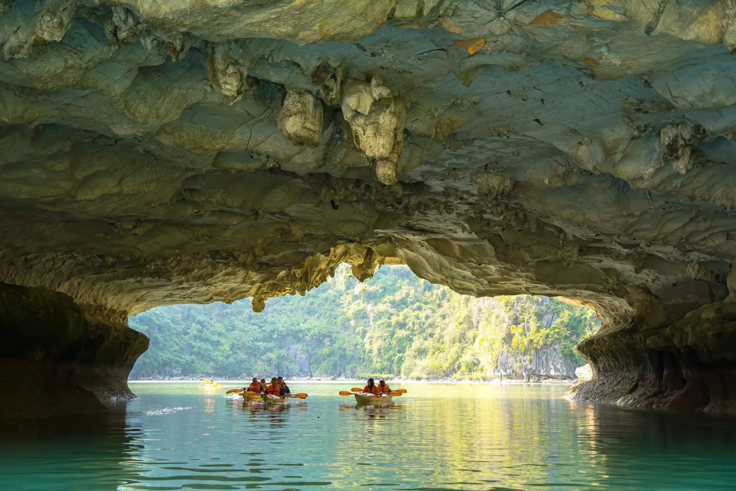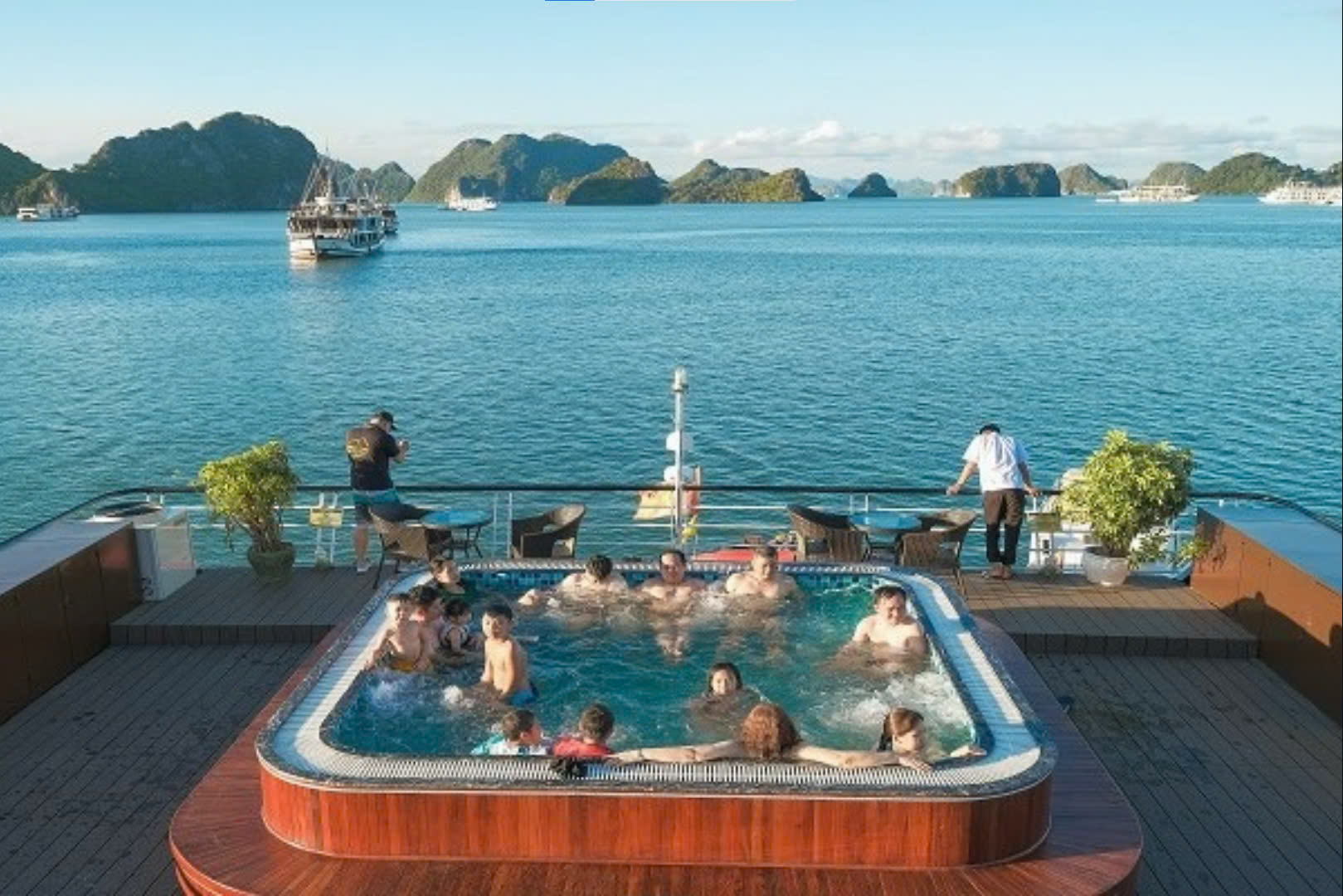 03:45 pm: The cruise will take you to the Ba Trai Dao area, where you can participate in kayaking activities. Afterward, guests can return to the cruise to swim or relax and sunbathe. (On days with unfavorable weather, for the safety of our guests, the itinerary will be adjusted to visit the Dark and Bright Cave – one of the most beautiful water caves in Lan Ha Bay, where guests can enjoy kayaking or scenic boat rides with a guide paddling for you.)